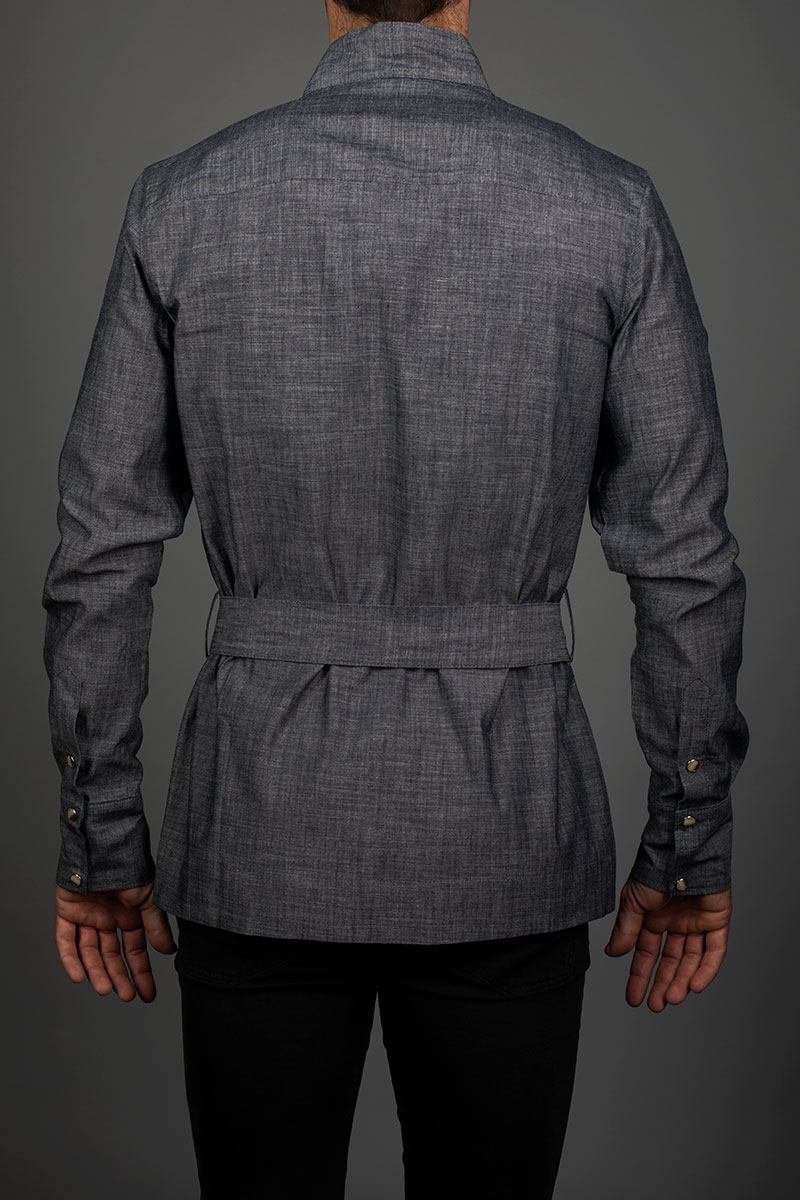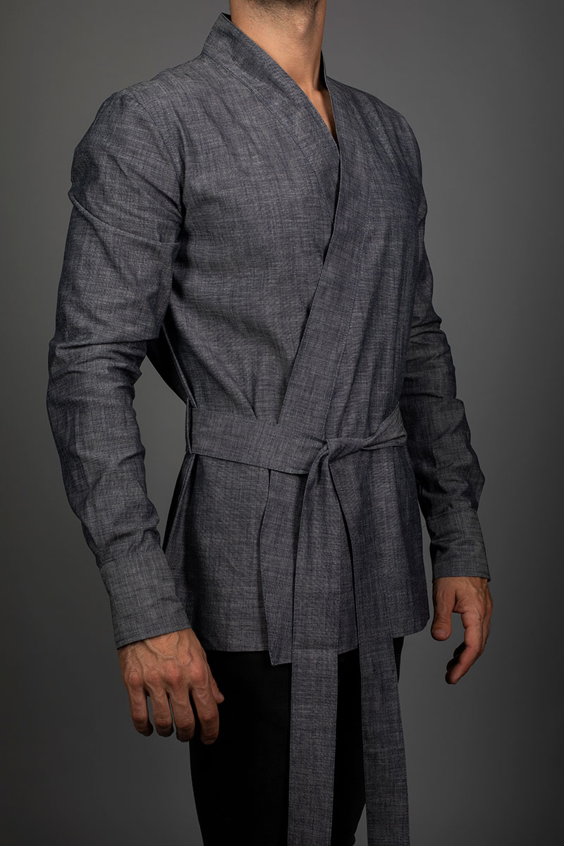 The result of this exclusive and original garment is the fusion between an elegant shirt and a kimono. A sophisticated and minimalist design suitable only for the most daring. A versatile and elegant garment that you can combine with jeans or suit pants. Made of 100% certified organic cotton, and woven in denim in its purest form.